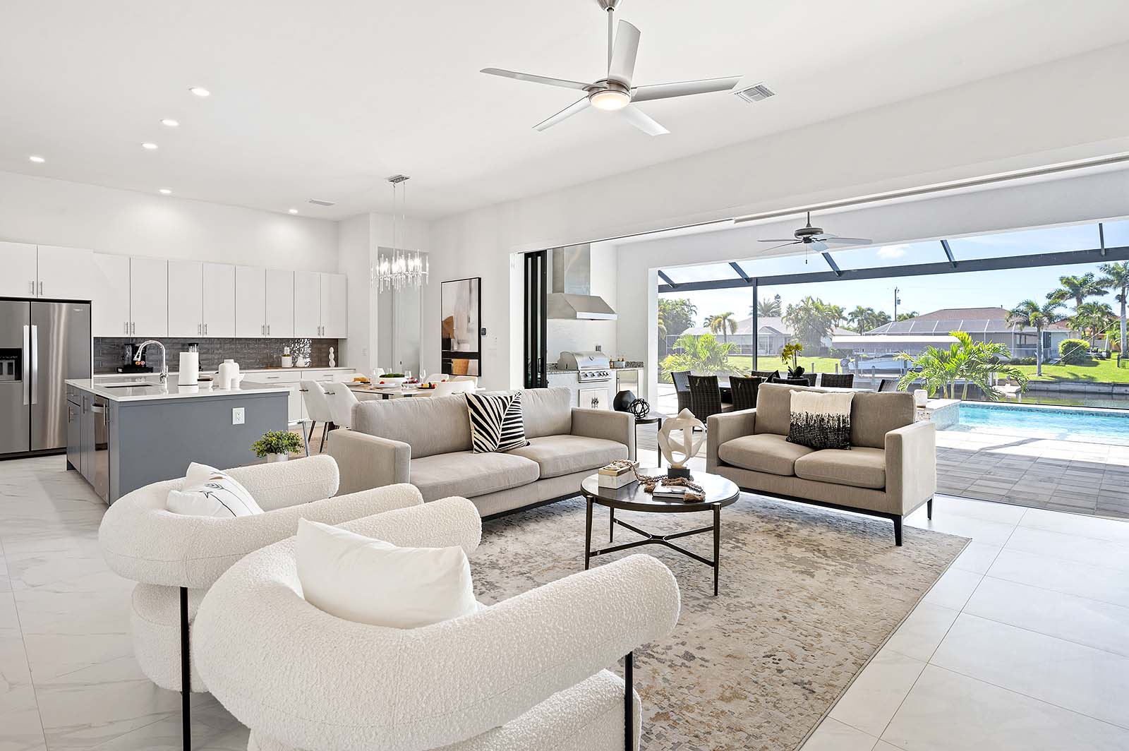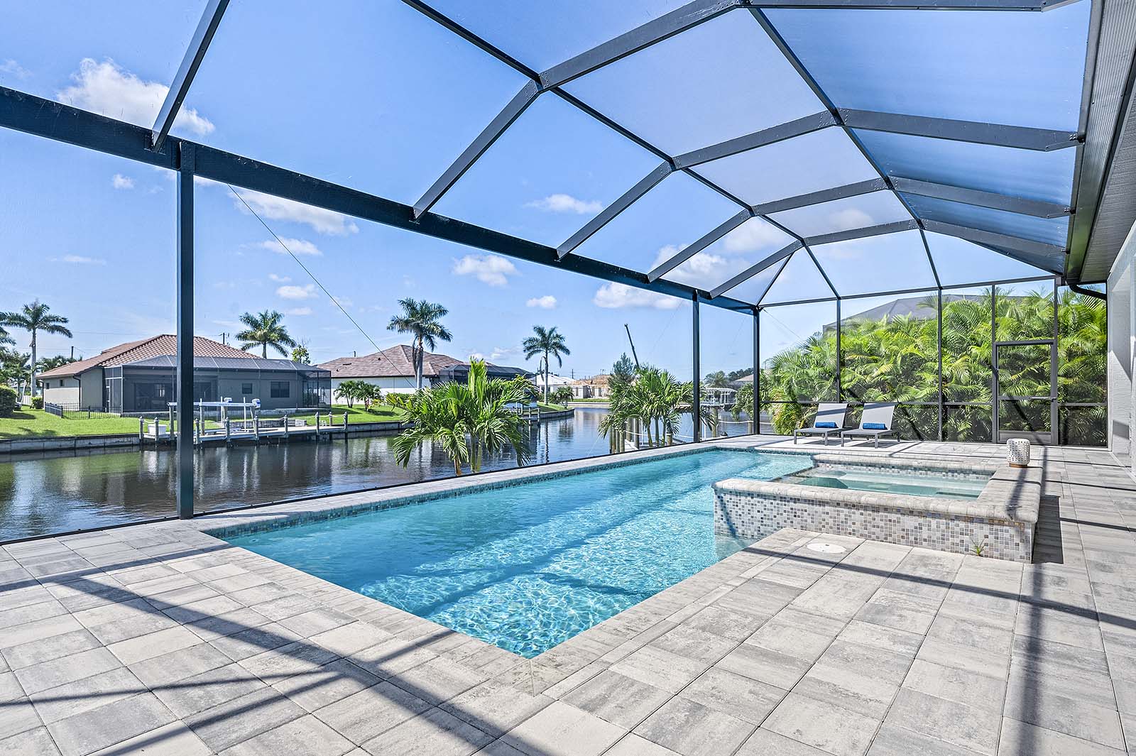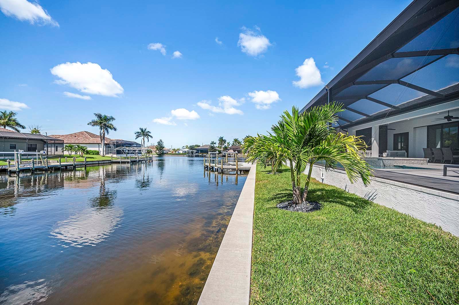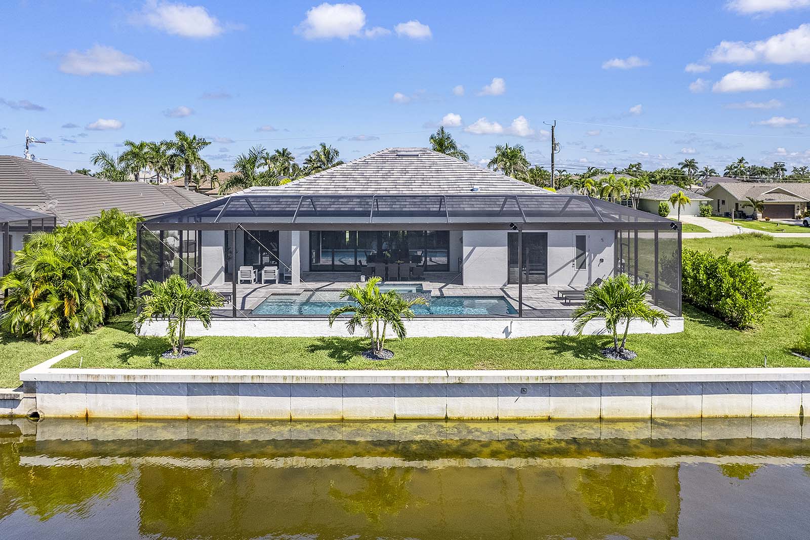Die moderne Villa aus dem Jahr 2025 erstreckt sich ebenerdig über ca. 228 m² klimatisierte Wohnfläche und befindet sich an einem Kanal in ruhiger und bevorzugter Lage im Südwesten von Cape Coral.