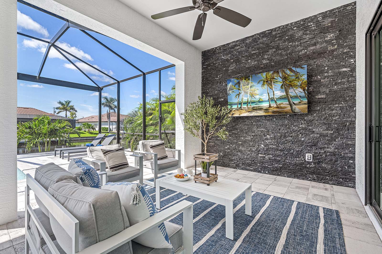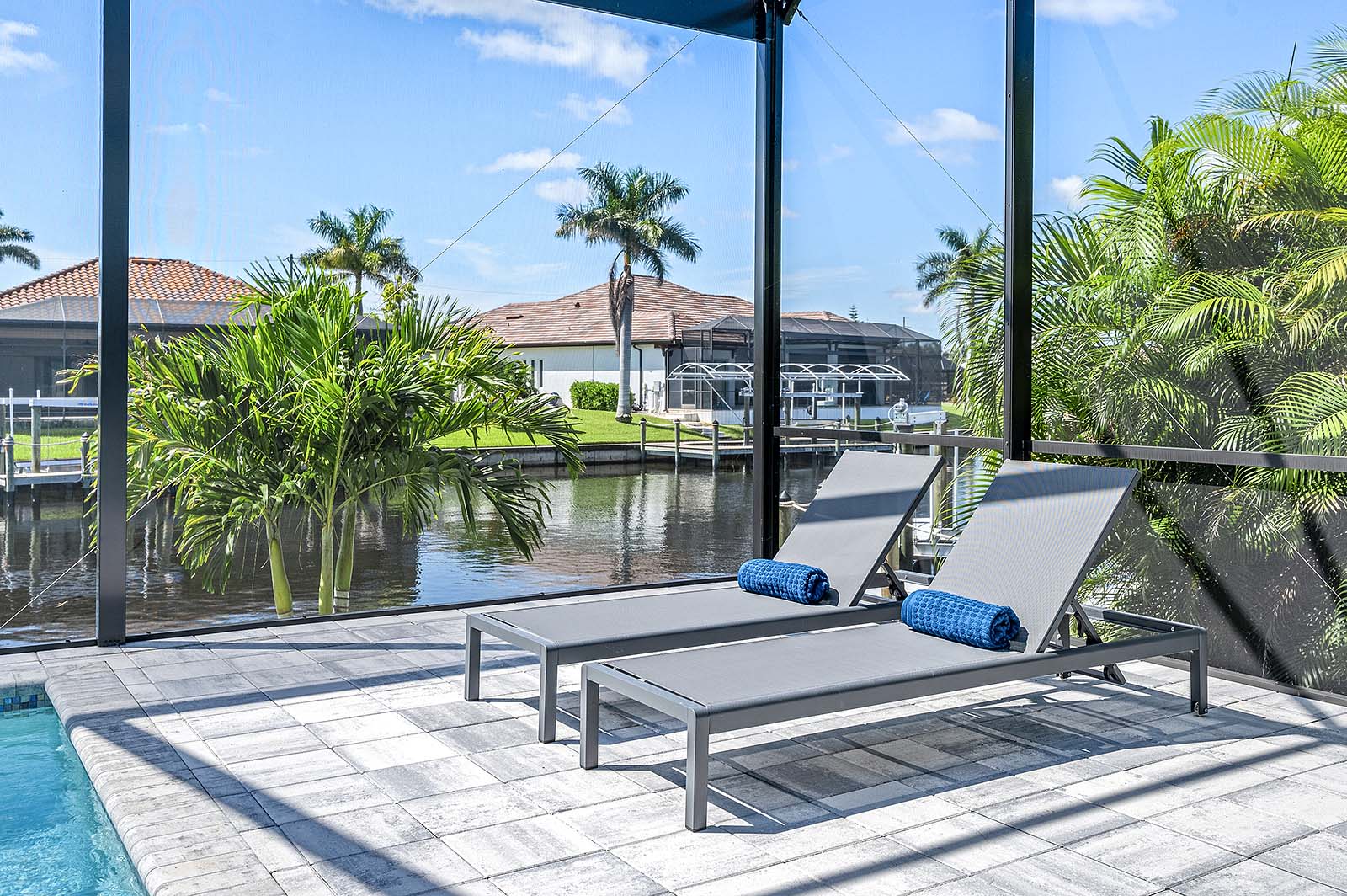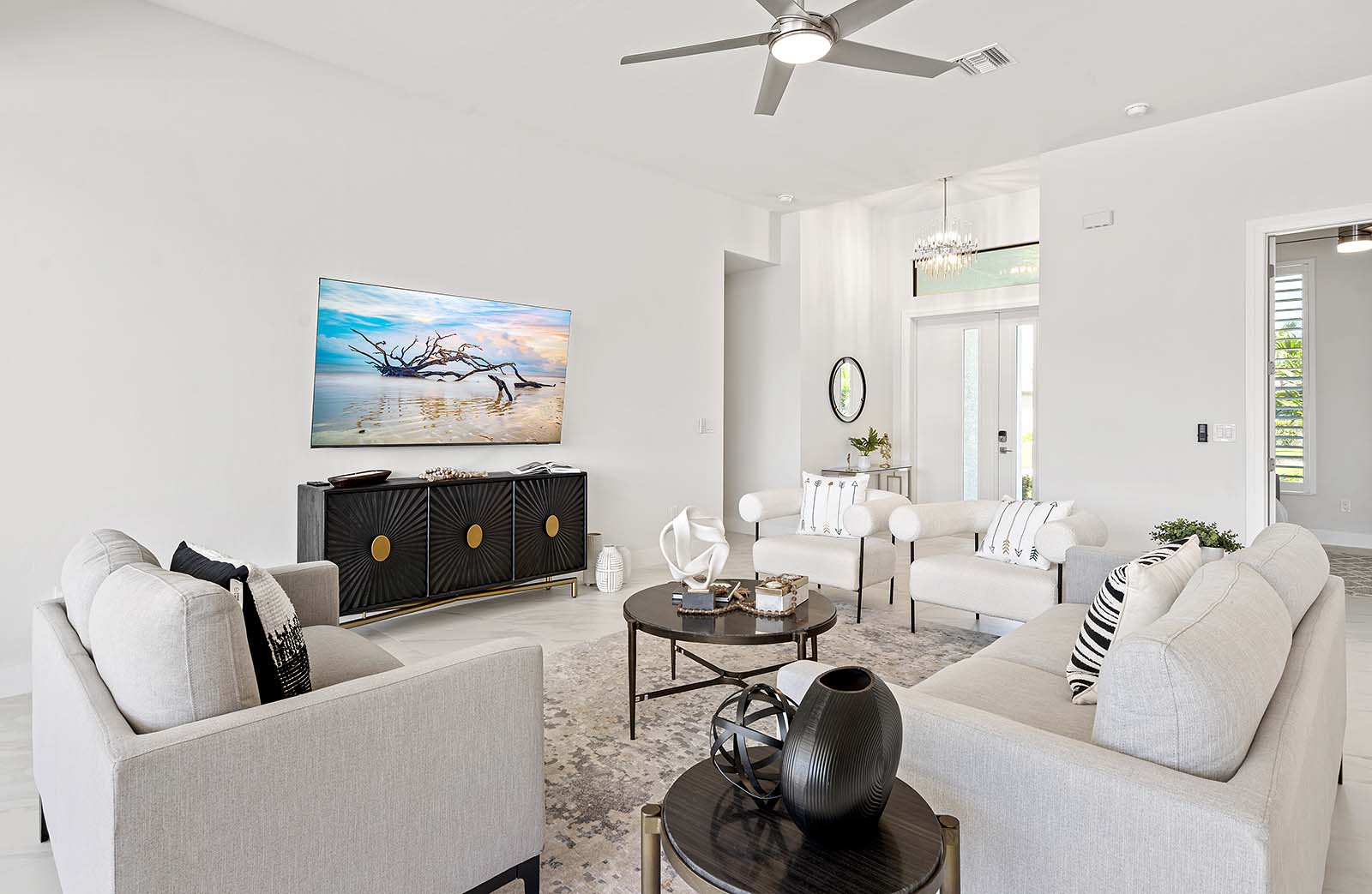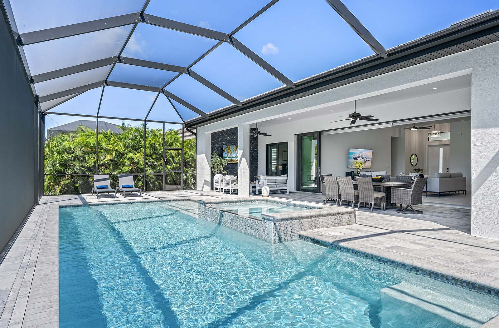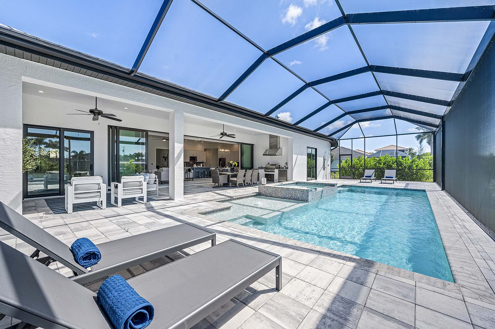 Die moderne Villa aus dem Jahr 2025 erstreckt sich ebenerdig über ca. 228 m² klimatisierte Wohnfläche und befindet sich an einem Kanal in ruhiger und bevorzugter Lage im Südwesten von Cape Coral.