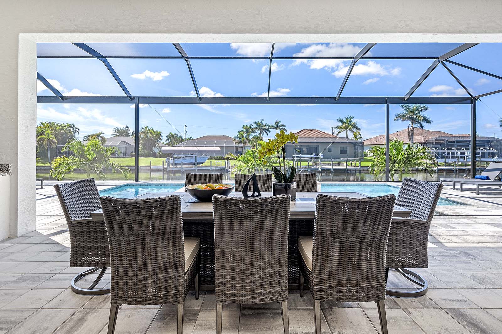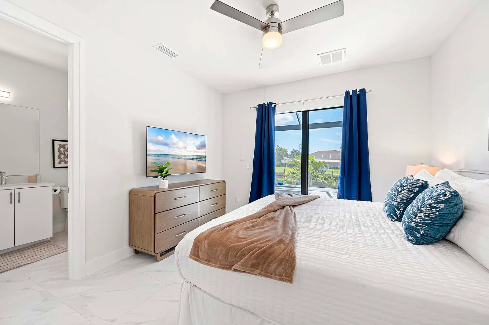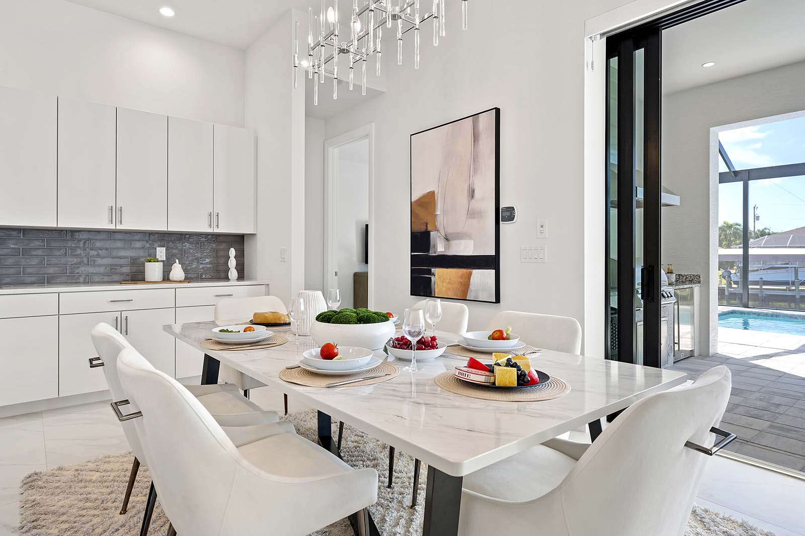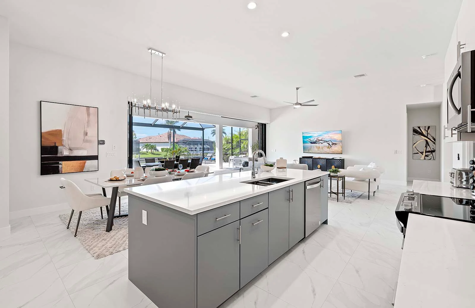 Die moderne Villa aus dem Jahr 2025 erstreckt sich ebenerdig über ca. 228 m² klimatisierte Wohnfläche und befindet sich an einem Kanal in ruhiger und bevorzugter Lage im Südwesten von Cape Coral.